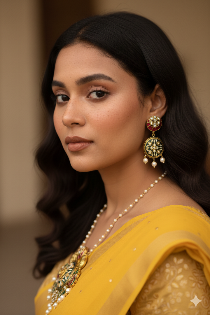 A vibrant, handcrafted Gold Meenakari Long Necklace, this piece features dual elephant motifs and a central pendant blooming with jewel-toned red and green enamel work on a delicate pearl chain. Elevate your traditional wardrobe with this ornate statement piece—a quintessential Jadau heirloom, perfect for a grand Indian Sangeet, upscale destination wedding, or any global festive gathering.