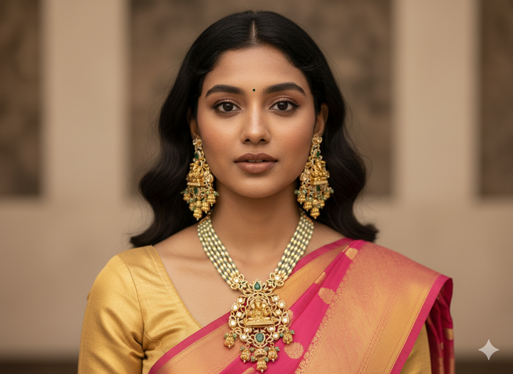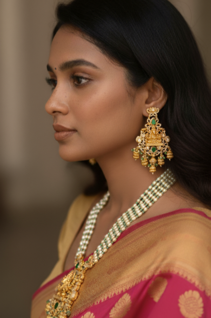 Traditional Temple Jewellery Necklace Set featuring the sacred Lord Ganesh Murti centerpiece and emerald-green stone inclusions. Handcrafted with an antique gold finish and detailed Green Kundan work, this heavy bridal choker includes matching goddess motif earrings.