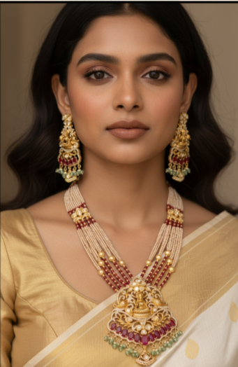This Temple Necklace with Multi-Strand Chain set features a large gold pendant with a detailed goddess motif, rich ruby-red stones, and delicate green bead drops, suspended from multiple strands of tiny cream and red pearl. The elegant, matching drop earrings complete this luxurious look, making it a perfect statement piece for a bride or any important religious celebration.