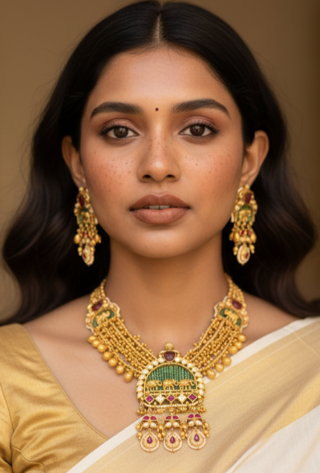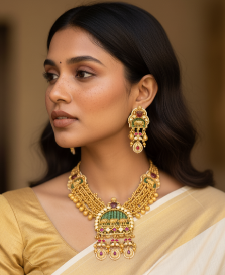 This spectacular heavy gold necklace features a half-moon pendant with rich green enamel work, intricate temple motifs, and dazzling ruby-red stones with beaded layers. The set includes perfectly matching drop earrings and is ideal for an opulent bridal look or any grand traditional celebration, capturing the essence of antique Indian design.
