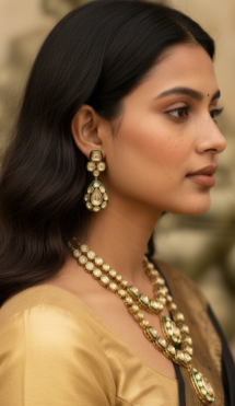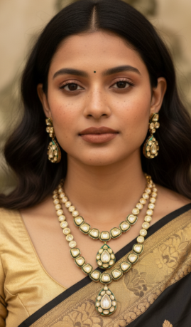 This beautiful two-strand gold necklace features sparkling, uncut diamonds set in an elegant frame with subtle green enamel, ending in a gorgeous teardrop pendant. The set includes perfectly matching drop earrings and is a classic choice for adding a refined, sophisticated sparkle to any wedding or festive outfit.
