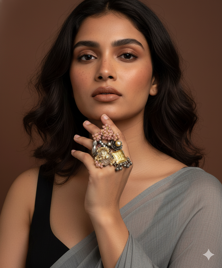 Oxidized Silver Statement Ring boasts a unique mixed-metal design, featuring a central antique gold floral square, a cluster of soft pink beads, and delicate pearl and ghungroo drops. Perfect to enhance a Boho look.